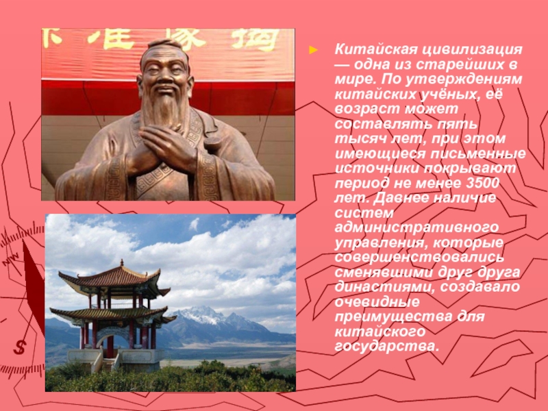 Слайд 4Китайская цивилизация — одна из старейших в мире. По утверждениям китайских учёных, её