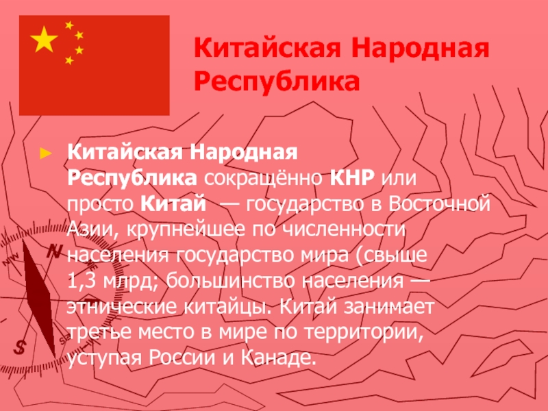 Слайд 2Китайская Народная Республика сокращённо КНР или просто Китай — государство в Восточной Азии, крупнейшее по численности населения государство мира
