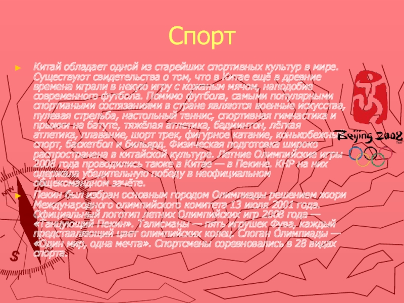 о том, что в Китае ещё в древние времена играли в некую игру с кожаным мячом, наподобие современного футбола. Помимо футбола, самыми популярными спортивными состязаниями в стране являются военные искусства, пулевая стрельба, настольный теннис, спортивная гимнастика и прыжки на батуте, тяжёлая атлетика, бадминтон, лёгкая атлетика, плавание, шорт трек, фигурное катание, конькобежный спорт, баскетбол и бильярд. Физическая подготовка широко распространена в китайской культуре. Летние Олимпийские игры 2008 года проводились также в Китае — в Пекине. КНР на них одержала убедительную победу в неофициальном общекомандном зачёте.