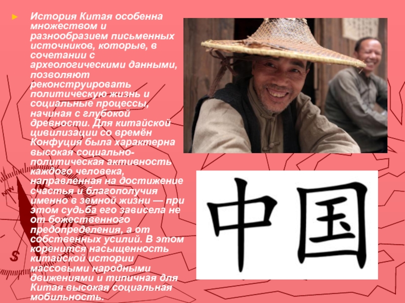 с археологическими данными, позволяют реконструировать политическую жизнь и социальные процессы, начиная с глубокой древности. Для китайской цивилизации со времён Конфуция была характерна высокая социально-политическая активность каждого человека, направленная на достижение счастья и благополучия именно в земной жизни — при этом судьба его зависела не от божественного предопределения, а от собственных усилий. В этом коренится насыщенность китайской истории массовыми народными движениями и типичная для Китая высокая социальная мобильность.