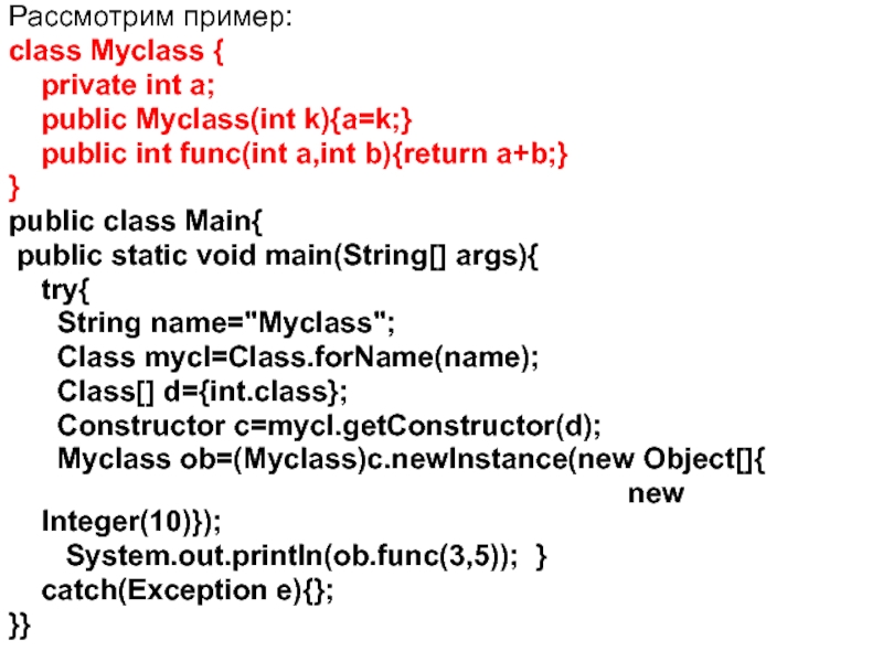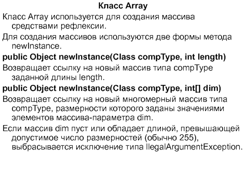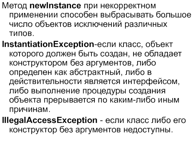 Слайд 14Метод newlnstance при некорректном применении способен выбрасывать большое число объектов исключений