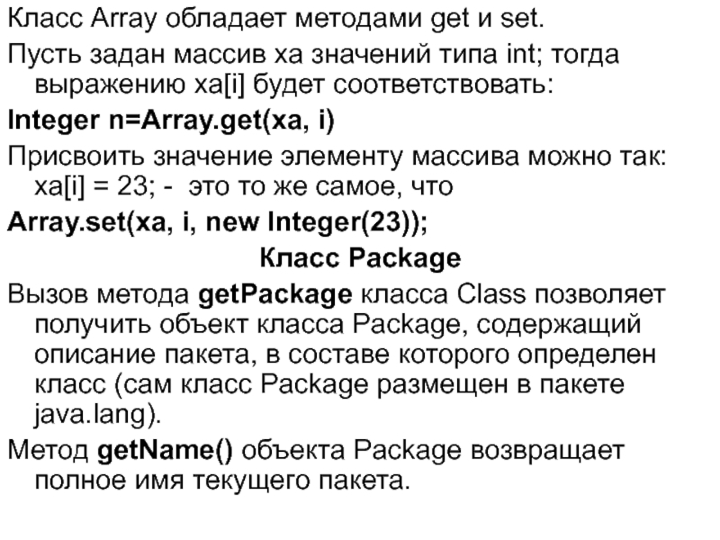 Существуют также методы имеющие вид getPrimitiveType (например, getInt) и setPrimitiveType. Эти методы можно использовать для изменения полей в классе, имеющих примитивный тип. Например,