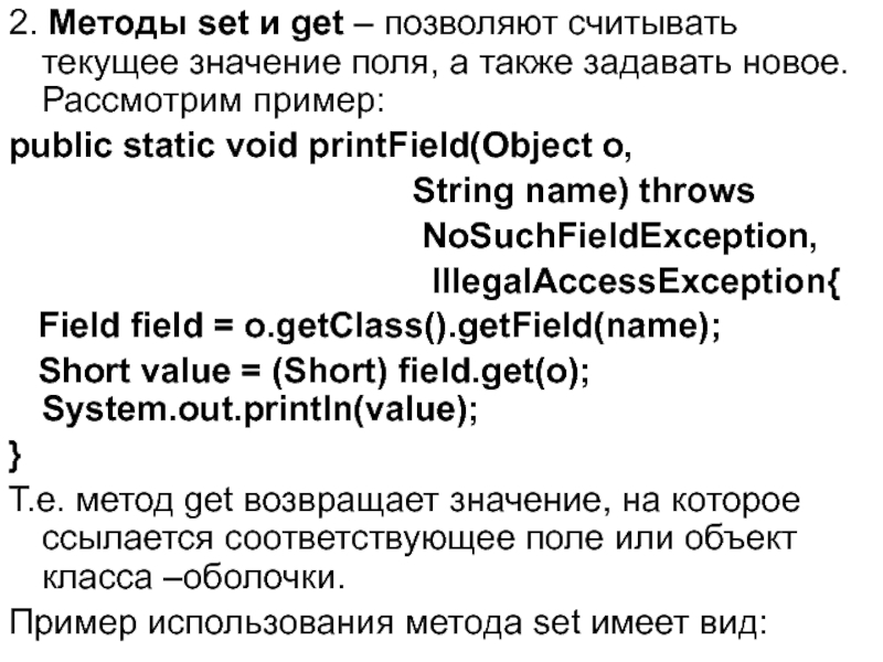 Слайд 52. Методы set и get – позволяют считывать текущее значение поля,