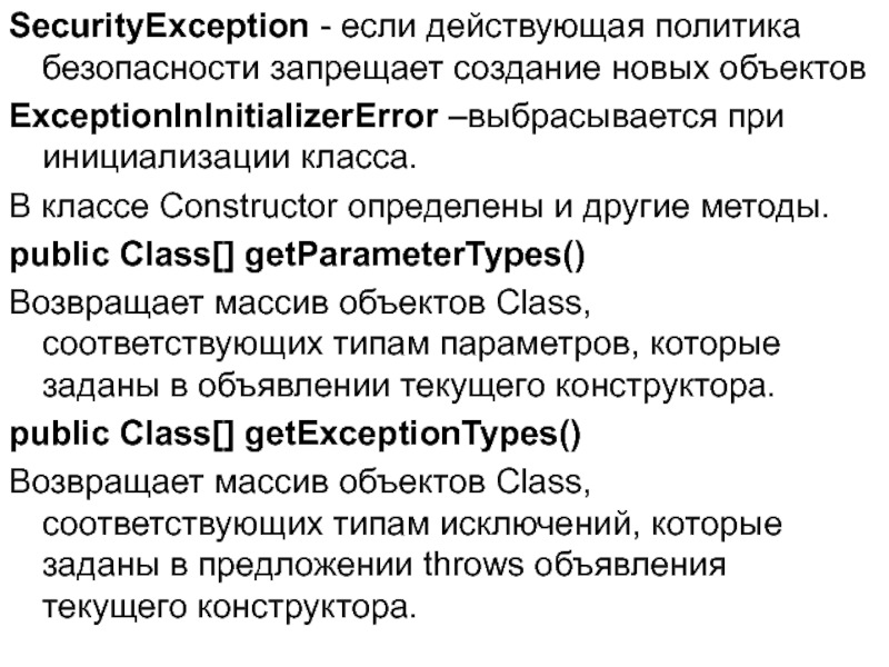 Слайд 15SecurityException - если действующая политика безопасности запрещает создание новых объектов