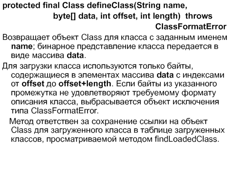 Для загрузки класса используются только байты, содержащиеся в элементах массива data с индексами от offset до offset+length. Если байты из указанного промежутка не удовлетворяют требуемому формату описания класса, выбрасывается объект исключения типа ClassFormatError.
