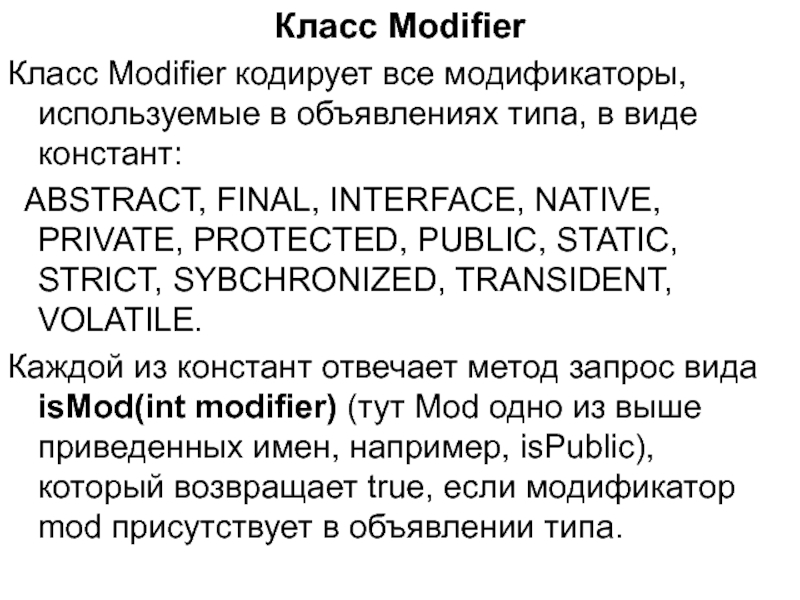 Каждой из констант отвечает метод запрос вида isMod(int modifier) (тут Mod одно из выше приведенных имен, например, isPublic), который возвращает true, если модификатор mod присутствует в объявлении типа.
