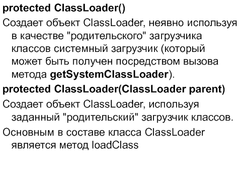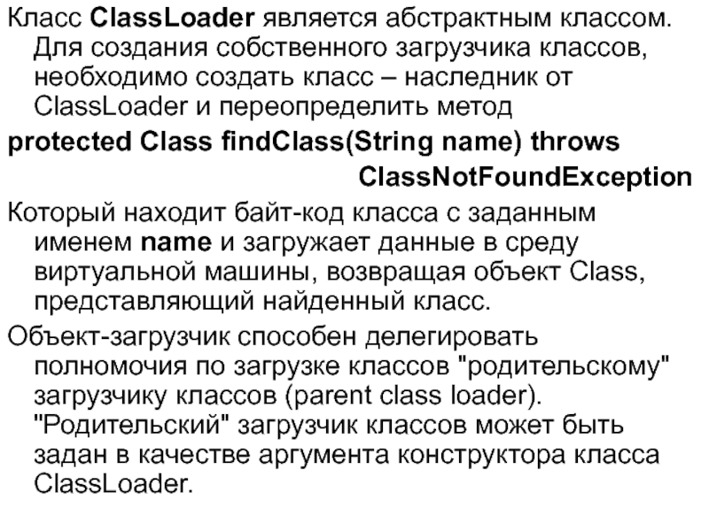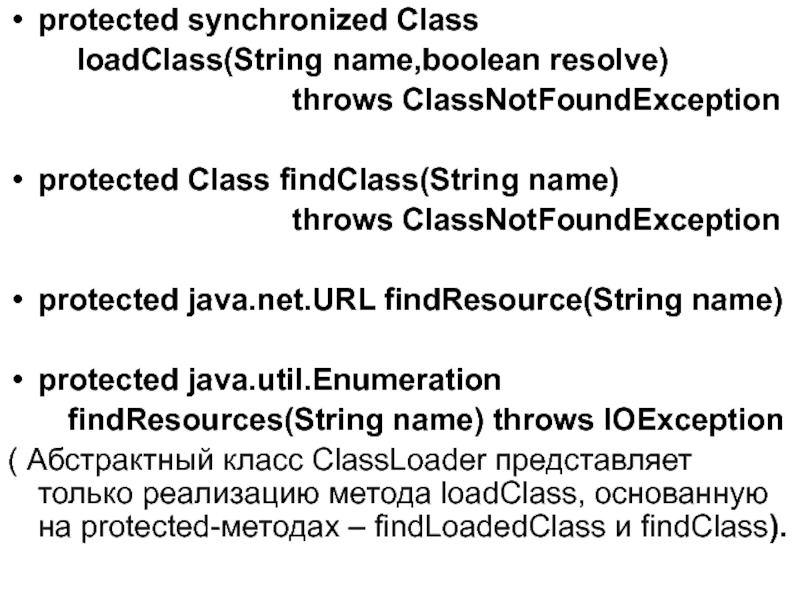 ( Абстрактный класс ClassLoader представляет только реализацию метода loadClass, основанную на protected-методах – findLoadedClass и findClass).