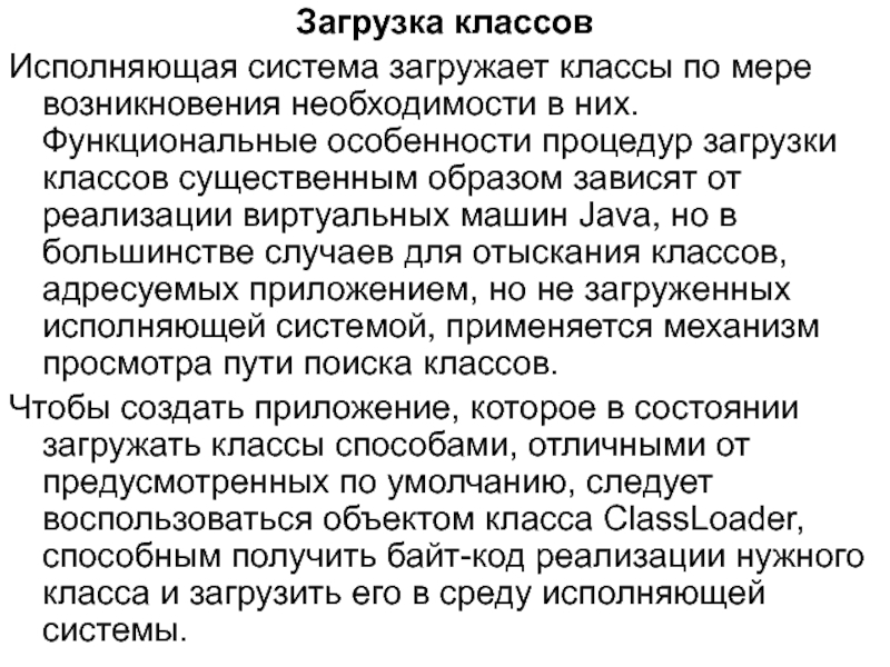 findLoadedClass класса ClassLoader, не загружался ли заданный класс раньше; в составе ClassLoader предусмотрена таблица объектов Class для всех классов, загруженных средствами текущего загрузчика классов; если класс был загружен прежде, метод findLoadedClass возвратит ссылку на существующий объект Class;