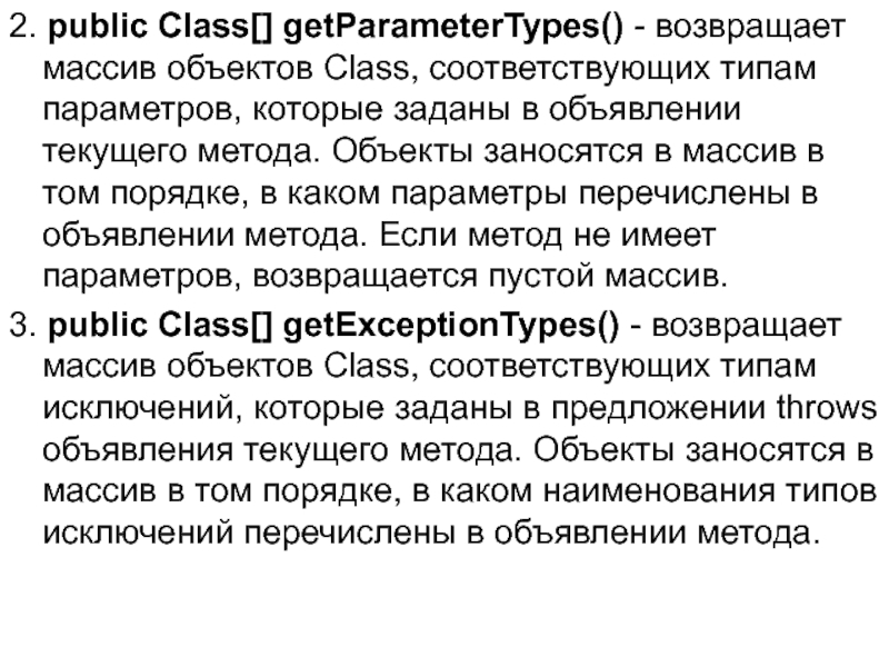 Слайд 82. public Class[] getParameterTypes() - возвращает массив объектов Class, соответствующих типам