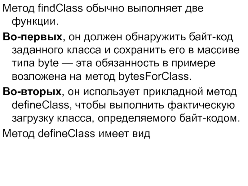 Слайд 40Метод findClass обычно выполняет две функции.