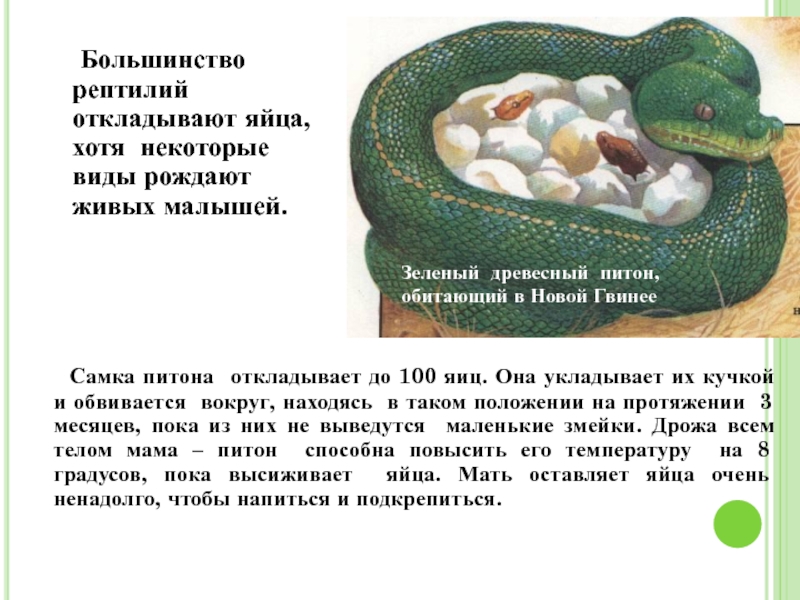Самка питона откладывает до 100 яиц. Она укладывает их кучкой и обвивается вокруг, находясь в таком положении на протяжении 3 месяцев, пока из них не выведутся маленькие змейки. Дрожа всем телом мама – питон способна повысить его температуру на 8 градусов, пока высиживает яйца. Мать оставляет яйца очень ненадолго, чтобы напиться и подкрепиться.