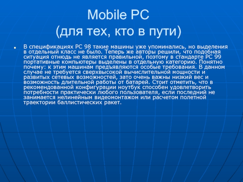 уже упоминались, но выделения в отдельный класс не было. Теперь же авторы решили, что подобная ситуация отнюдь не является правильной, поэтому в стандарте РС 99 портативные компьютеры выделены в отдельную категорию. Понятно почему: к этим машинам предъявляются особые требования. В данном случае не требуется сверхвысокой вычислительной мощности и развитых сетевых возможностей, зато очень важны низкий вес и возможность длительной работы от батарей. Стоит отметить, что в рекомендованной конфигурации ноутбук способен удовлетворить потребности практически любого пользователя, если последний не занимается нелинейным видеомонтажом или расчетом полетной траектории баллистических ракет.