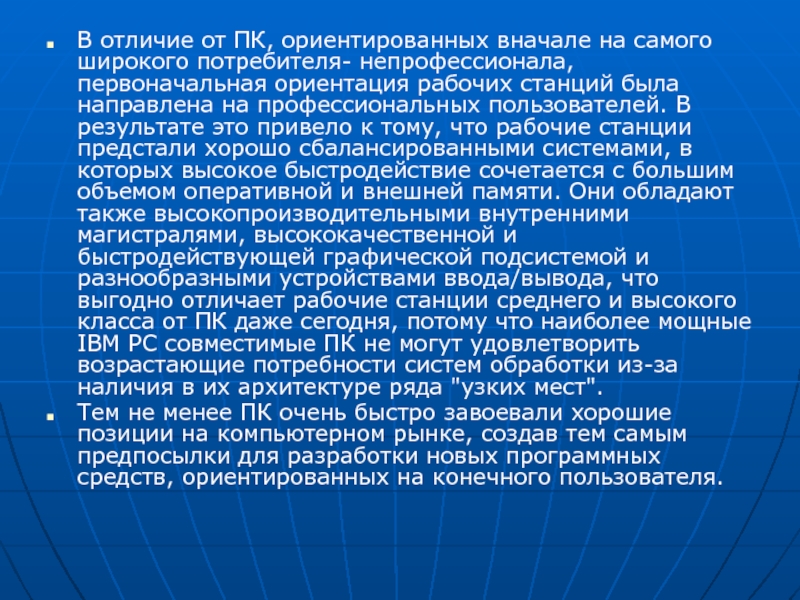 первоначальная ориентация рабочих станций была направлена на профессиональных пользователей. В результате это привело к тому, что рабочие станции предстали хорошо сбалансированными системами, в которых высокое быстродействие сочетается с большим объемом оперативной и внешней памяти. Они обладают также высокопроизводительными внутренними магистралями, высококачественной и быстродействующей графической подсистемой и разнообразными устройствами ввода/вывода, что выгодно отличает рабочие станции среднего и высокого класса от ПК даже сегодня, потому что наиболее мощные IBM PC совместимые ПК не могут удовлетворить возрастающие потребности систем обработки из-за наличия в их архитектуре ряда "узких мест".