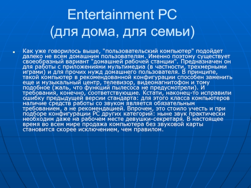 далеко не всем домашним пользователям. Именно поэтому существует своеобразный вариант "домашней рабочей станции". Предназначен он для работы с приложениями мультимедиа (в частности, трехмерными играми) и для прочих нужд домашнего пользователя. В принципе, такой компьютер в рекомендованной конфигурации способен заменить еще и музыкальный центр, телевизор, видеомагнитофон и тому подобное (жаль, что функций пылесоса не предусмотрели). И требования, конечно, соответствующие. Кстати, наконец-то исправили ошибку предыдущей версии стандарта: для этого класса компьютеров наличие средств работы со звуком является обязательным требованием, а не рекомендацией. Впрочем, это стоило учесть и при подборе конфигурации РС других категорий: ныне звук практически необходим даже на рабочем месте девушки-секретаря. В настоящее время во всем мире продажа компьютера без звуковой карты становится скорее исключением, чем правилом.
