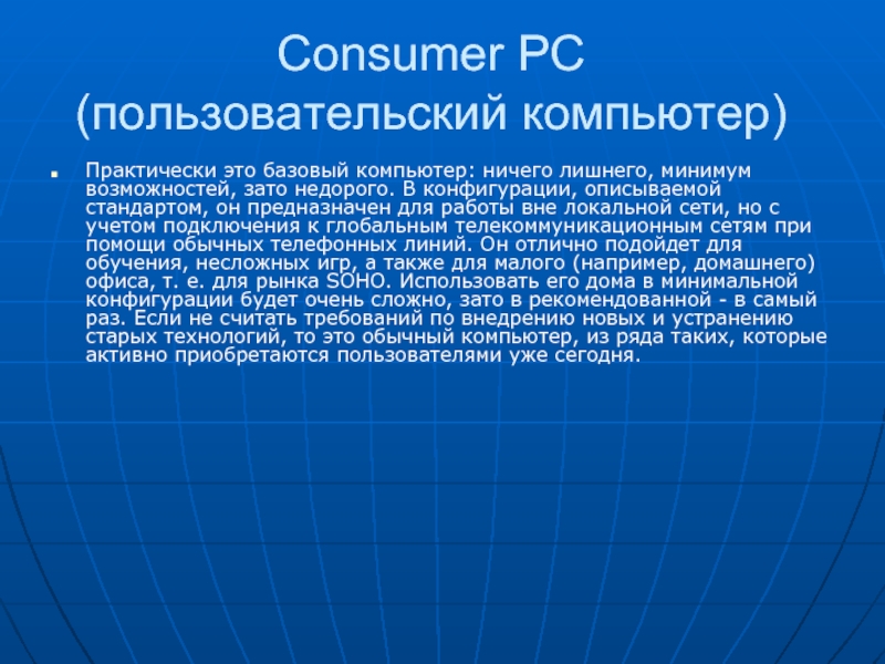 недорого. В конфигурации, описываемой стандартом, он предназначен для работы вне локальной сети, но с учетом подключения к глобальным телекоммуникационным сетям при помощи обычных телефонных линий. Он отлично подойдет для обучения, несложных игр, а также для малого (например, домашнего) офиса, т. е. для рынка SOHO. Использовать его дома в минимальной конфигурации будет очень сложно, зато в рекомендованной - в самый раз. Если не считать требований по внедрению новых и устранению старых технологий, то это обычный компьютер, из ряда таких, которые активно приобретаются пользователями уже сегодня.