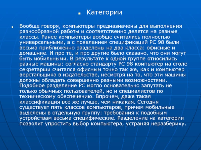 на разные классы. Ранее компьютеры вообще считались полностью универсальными, а с появлением спецификаций РС 98 были весьма приближенно разделены на два класса: офисные и домашние. И про те, и про другие было сказано, что они могут быть мобильными. В результате к одной группе относились разные машины: согласно стандарту РС 98 компьютер на столе секретарши считался офисным точно так же, как и компьютер верстальщика в издательстве, несмотря на то, что эти машины должны обладать совершенно разными возможностями. Подобное разделение РС могло основательно запутать не только обычных пользователей, но и специалистов по техническому обеспечению. Впрочем, даже такая классификация все же лучше, чем никакая. Сегодня существует пять классов компьютеров, причем мобильные выделены в отдельную группу: требования к подобным устройствам весьма специфические. Разделение на категории позволит упростить выбор компьютера, устраняя неразбериху.
