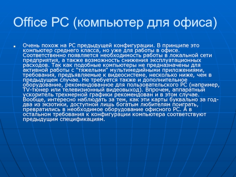 принципе это компьютер среднего класса, но уже для работы в офисе. Соответственно появляется необходимость работы в локальной сети предприятия, а также возможность снижения эксплуатационных расходов. Так как подобные компьютеры не предназначены для активной работы с "тяжелыми" мультимедийными приложениями, требования, предъявляемые к видеосистеме, несколько ниже, чем в предыдущем случае. Не требуется также и дополнительное оборудование, рекомендованное для пользовательского PC (например, TV-тюнер или телевизионный видеовыход). Впрочем, аппаратный ускоритель трехмерной графики рекомендован и в этом случае. Вообще, интересно наблюдать за тем, как эти карты буквально за год-два из экзотики, доступной лишь богатым любителям поиграть, превратились в необходимое оборудование офисного РС. А в остальном требования к конфигурации компьютера соответствуют предыдущим спецификациям.