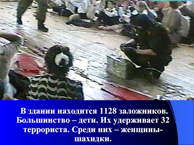 Слайд 6 В здании находится 1128 заложников. Большинство – дети. Их удерживает 32