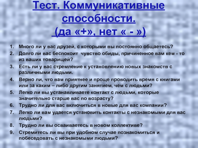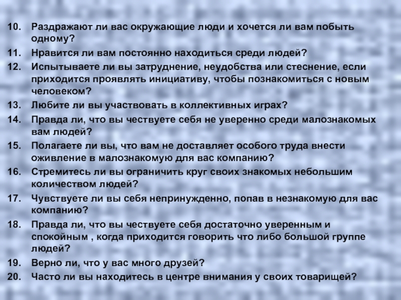 Полагаете ли вы, что вам не доставляет особого труда внести оживление в малознакомую для вас компанию?