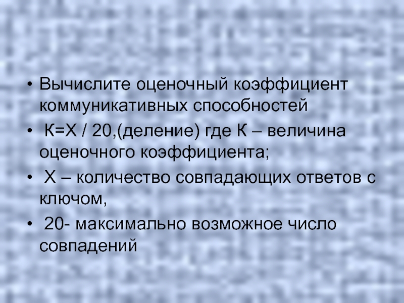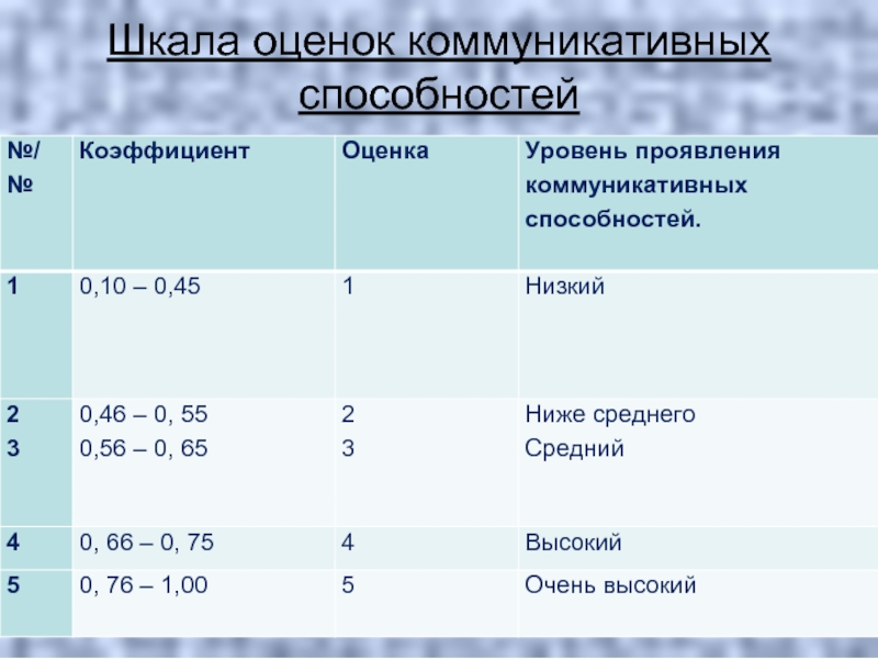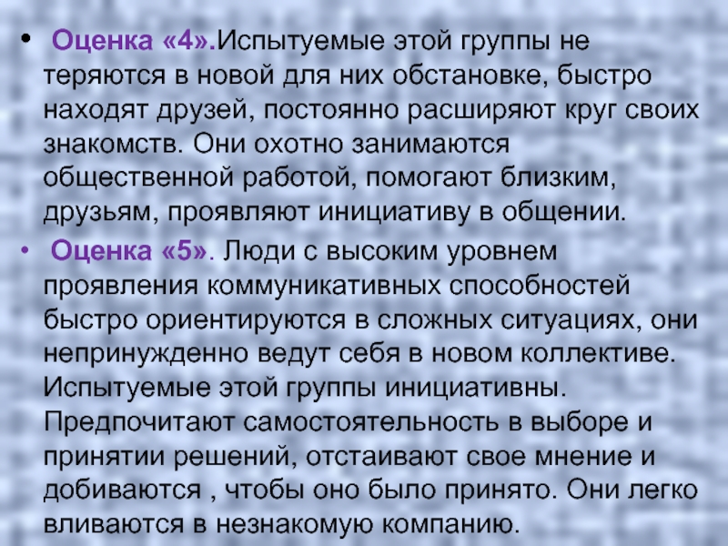 Оценка «5». Люди с высоким уровнем проявления коммуникативных способностей быстро ориентируются в сложных ситуациях, они непринужденно ведут себя в новом коллективе. Испытуемые этой группы инициативны. Предпочитают самостоятельность в выборе и принятии решений, отстаивают свое мнение и добиваются , чтобы оно было принято. Они легко вливаются в незнакомую компанию.
