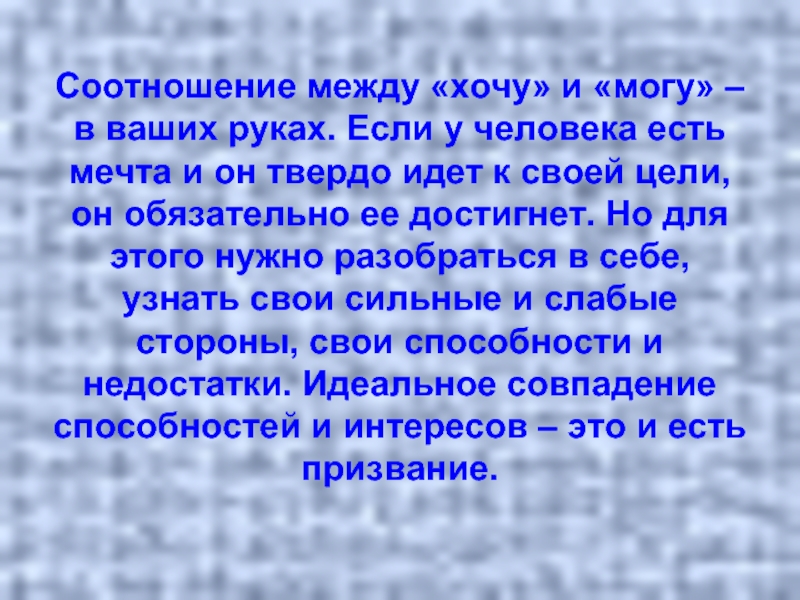 человека есть мечта и он твердо идет к своей цели, он обязательно ее достигнет. Но для этого нужно разобраться в себе, узнать свои сильные и слабые стороны, свои способности и недостатки. Идеальное совпадение способностей и интересов – это и есть призвание.