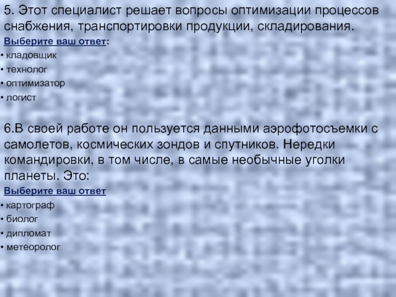 6.В своей работе он пользуется данными аэрофотосъемки с самолетов, космических зондов и спутников. Нередки командировки, в том числе, в самые необычные уголки планеты. Это: