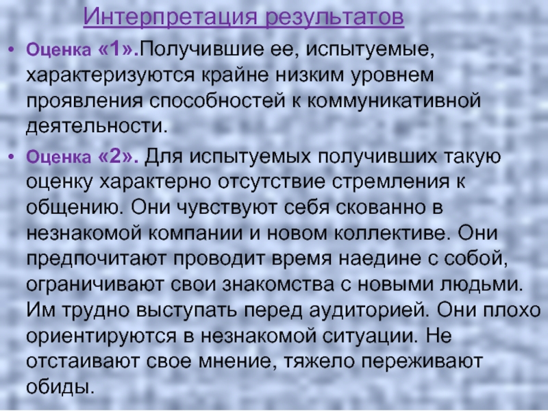 Оценка «2». Для испытуемых получивших такую оценку характерно отсутствие стремления к общению. Они чувствуют себя скованно в незнакомой компании и новом коллективе. Они предпочитают проводит время наедине с собой, ограничивают свои знакомства с новыми людьми. Им трудно выступать перед аудиторией. Они плохо ориентируются в незнакомой ситуации. Не отстаивают свое мнение, тяжело переживают обиды.