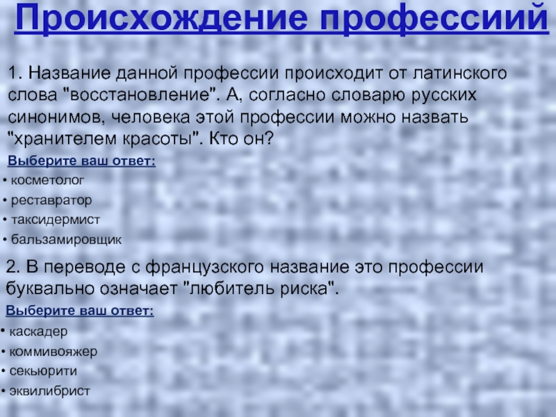 1. Название данной профессии происходит от латинского слова "восстановление". А, согласно