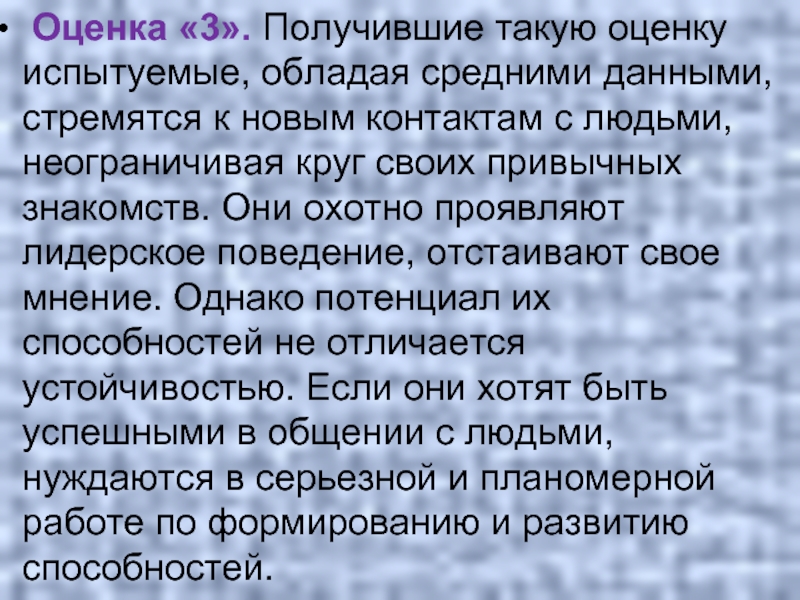 Оценка «3». Получившие такую оценку испытуемые, обладая средними данными, стремятся