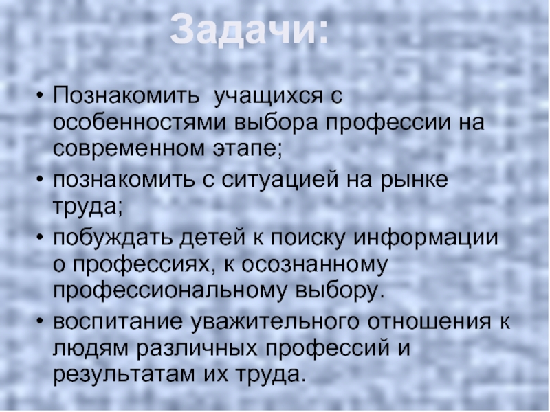 Познакомить учащихся с особенностями выбора профессии на современном этапе;