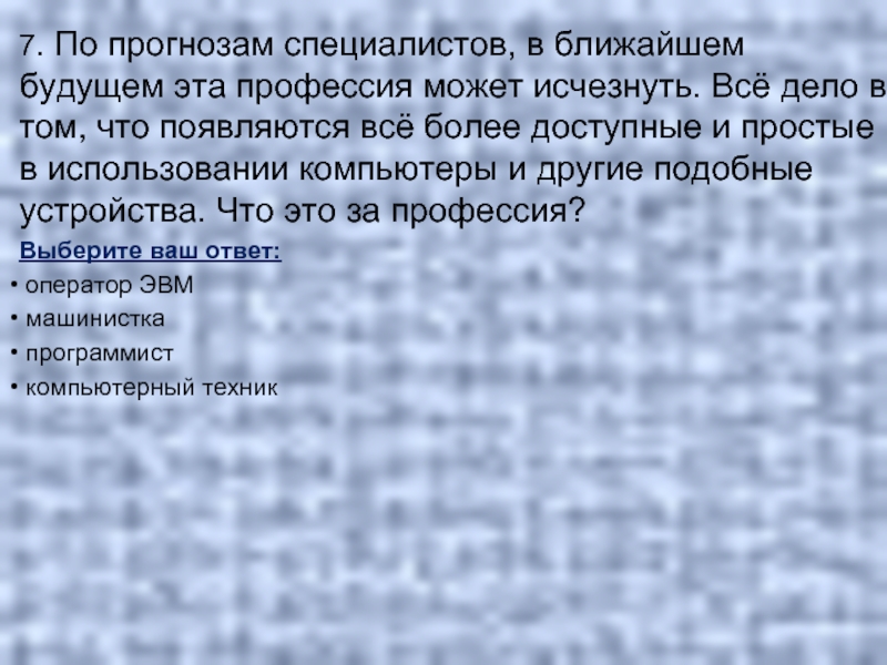 7. По прогнозам специалистов, в ближайшем будущем эта профессия может исчезнуть.