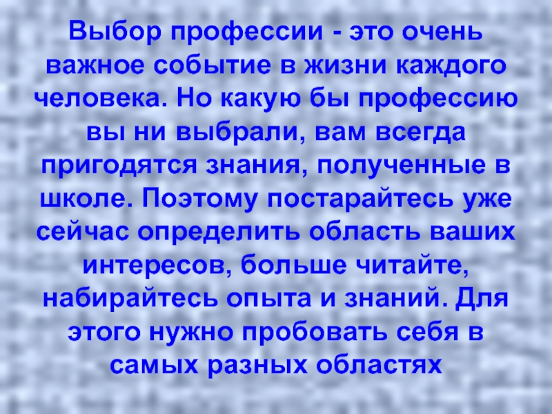 Но какую бы профессию вы ни выбрали, вам всегда пригодятся знания, полученные в школе. Поэтому постарайтесь уже сейчас определить область ваших интересов, больше читайте, набирайтесь опыта и знаний. Для этого нужно пробовать себя в самых разных областях