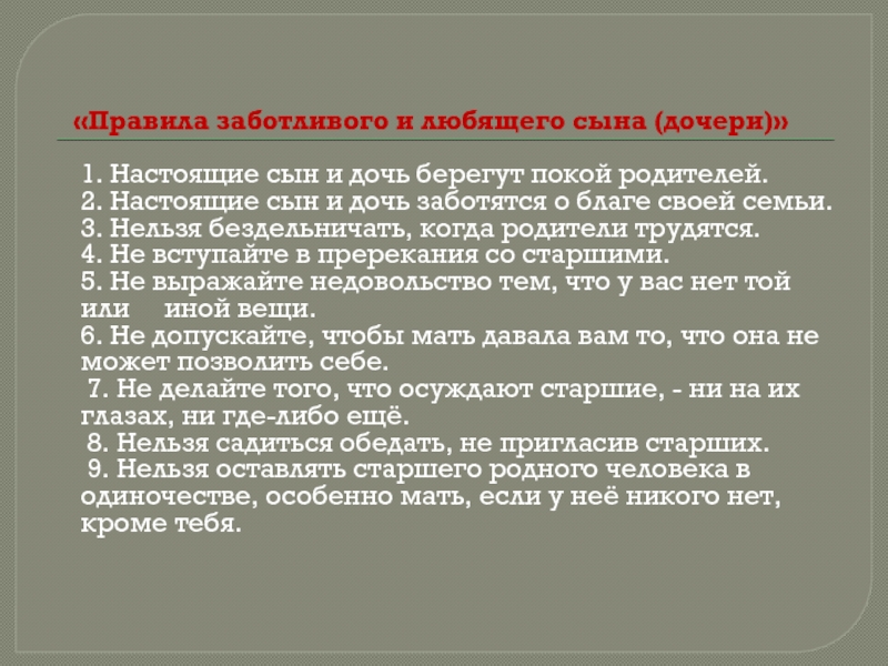 Слайд 15  «Правила заботливого и любящего сына (дочери)»