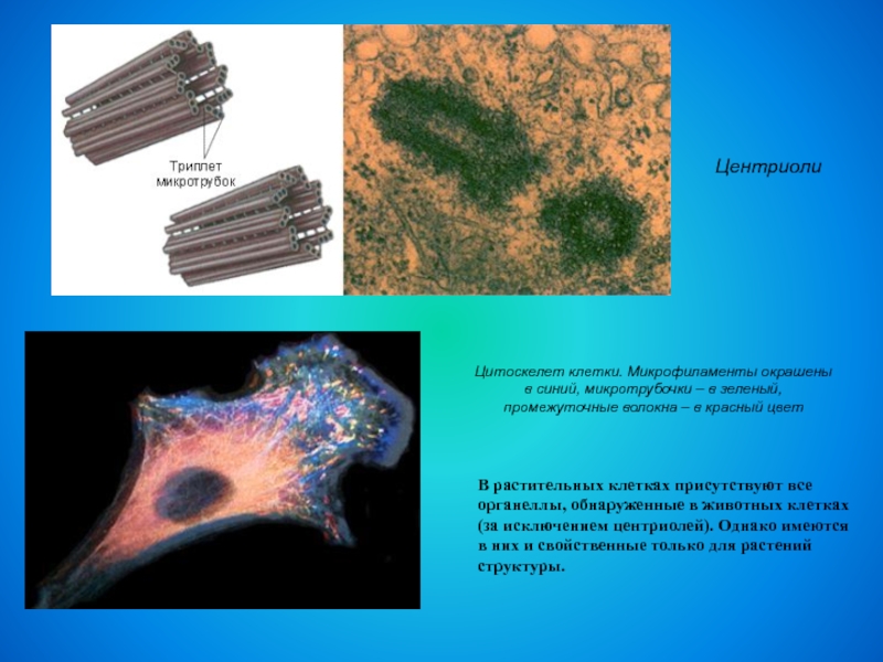 Почти во всех эукариотических клетках имеются полые цилиндрические органеллы диаметром около 25 нм, называющиеся микротрубочками. В длину они могут достигать нескольких микрометров. Стенки микротрубочек сложены из белка тубулина. В клетках животных и низших растений встречаются центриоли – мелкие полые цилиндры длиной в десятые доли микрометра, построенные из 27 микротрубочек. Во время деления клетки они образуют веретено, вдоль которого выстраиваются хромосомы. Центриолям по структурам идентичны базальные тельца, содержащиеся в жгутиках и ресничках. Эти органеллы вызывают биением жгутиков. Другая функция микротрубочек – транспорт питательных веществ. Микротрубочки представляют собой достаточно жёсткие структуры и поддерживают форму клетки, образуя своеобразный цитоскелет. С опорой и движением связана и ещё одна форма органелл – микрофиламенты – тонкие белковые нити диаметром 5–7 нм.