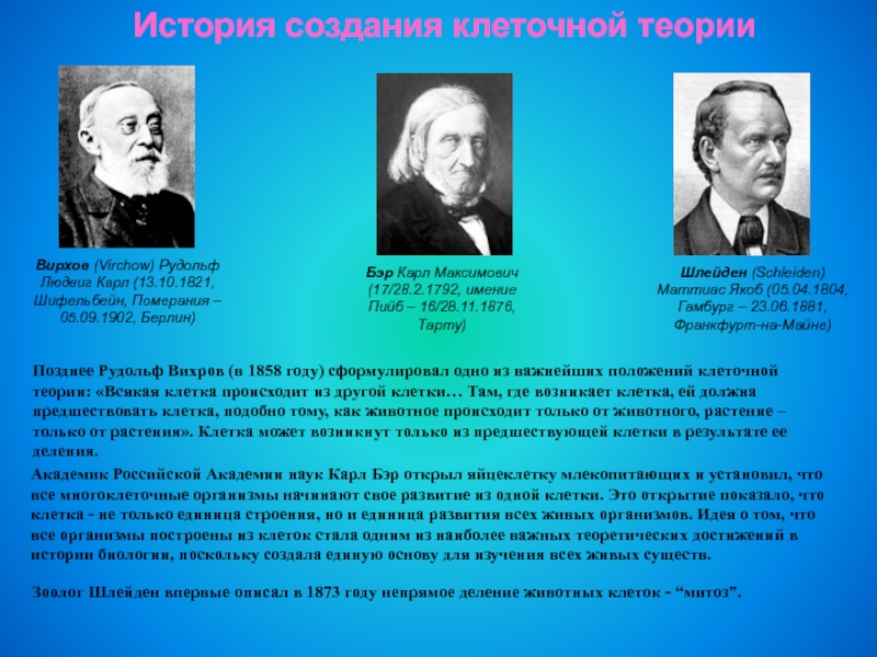 Т. Шванн и М. Шлейден ошибочно считали, что клетки в организме возникают из первичного неклеточного вещества.