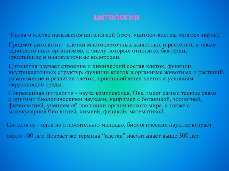 Современная цитология - наука комплексная. Она имеет самые тесные связи с другими биологическими науками, например с ботаникой, зоологией, физиологией, учением об эволюции органического мира, а также с молекулярной биологией, химией, физикой, математикой.