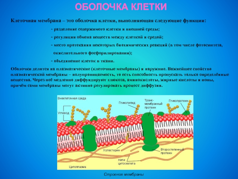 Для того, чтобы поддерживать в себе необходимую концентрацию веществ, клетка должна быть физически отделена от своего окружения. Вместе с тем, жизнедеятельность организма предполагает интенсивный обмен веществ между клетками. Роль барьера между клетками играет плазматическая мембрана. Внутреннее строение клетки долгое время было загадкой для ученых; считалось, что мембрана ограничивает протоплазму – некую жидкость, в которой и происходят все биохимические процессы. Благодаря электронной микроскопии тайну протоплазмы удалось раскрыть, и сейчас известно, что внутри клетки имеются цитоплазма, в которой присутствуют различные органоиды, и генетический материал в виде ДНК, собранный, в основном, в ядре (у эукариот).