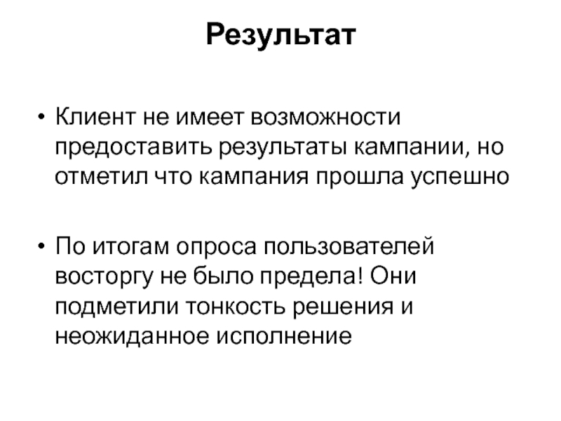 Клиент не имеет возможности предоставить результаты кампании, но отметил что кампания