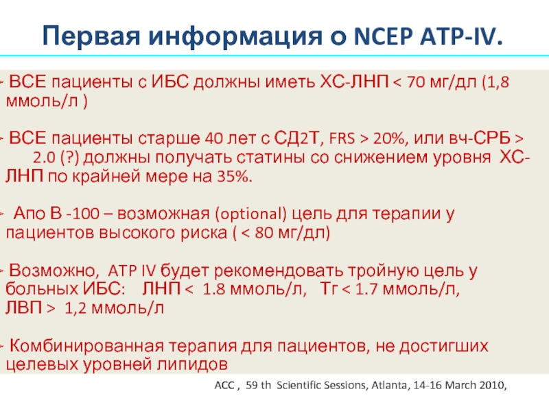 Возможно, ATP IV будет рекомендовать тройную цель у больных ИБС: ЛНП < 1.8 ммоль/л, Тг < 1.7 ммоль/л, ЛВП > 1,2 ммоль/л
