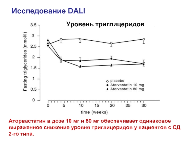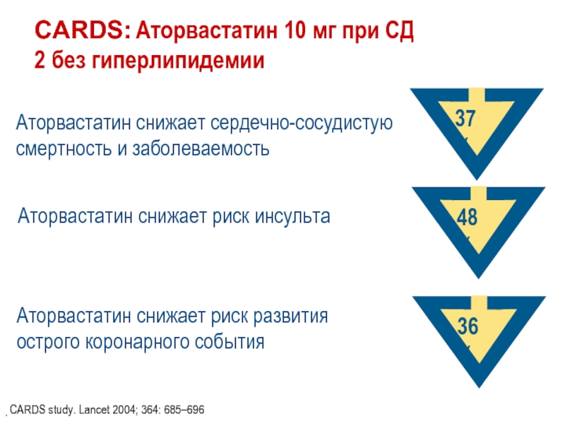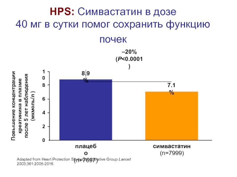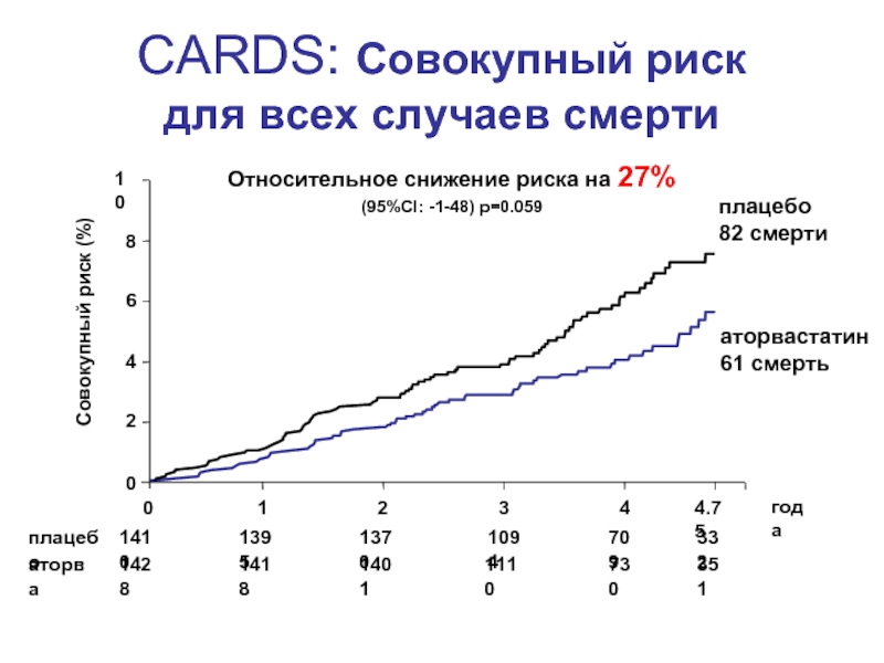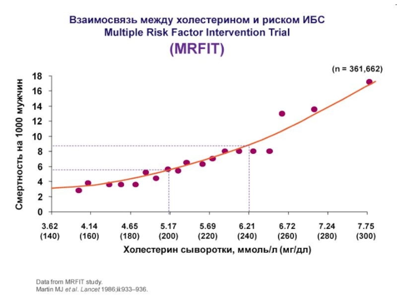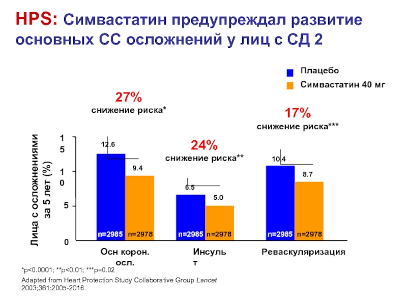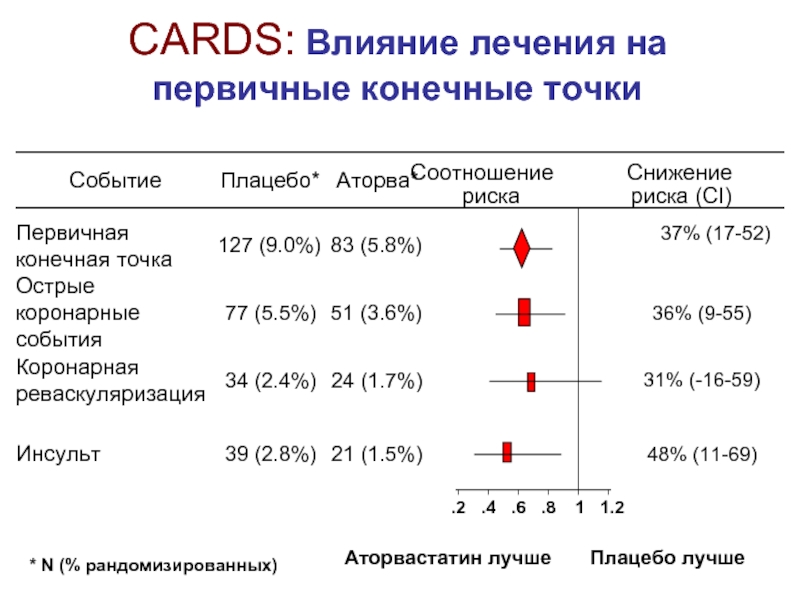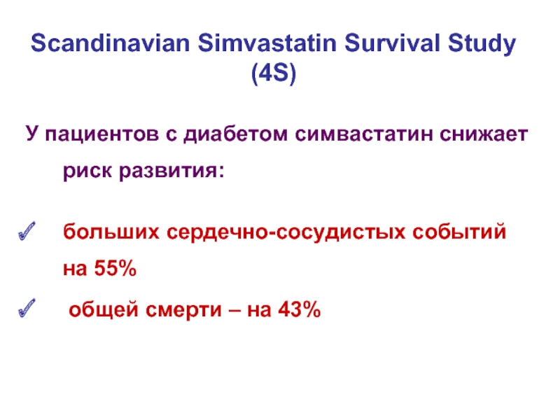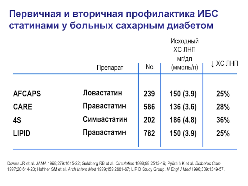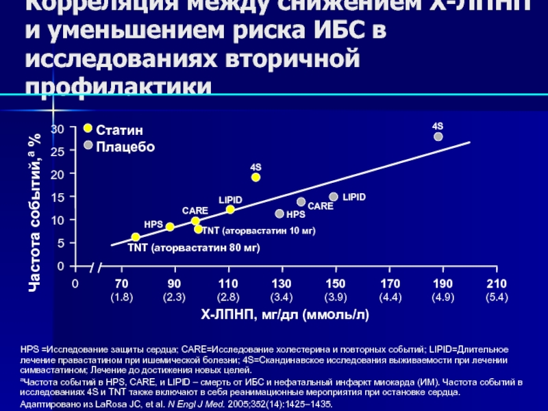HPS =Исследование защиты сердца; CARE=Исследование холестерина и повторных событий; LIPID=Длительное лечение правастатином при ишемической болезни; 4S=Скандинавское исследования выживаемости при лечении симвастатином; Лечение до достижения новых целей.