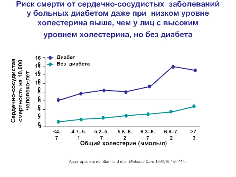 у больных диабетом даже при низком уровне холестерина выше, чем у лиц с высоким
