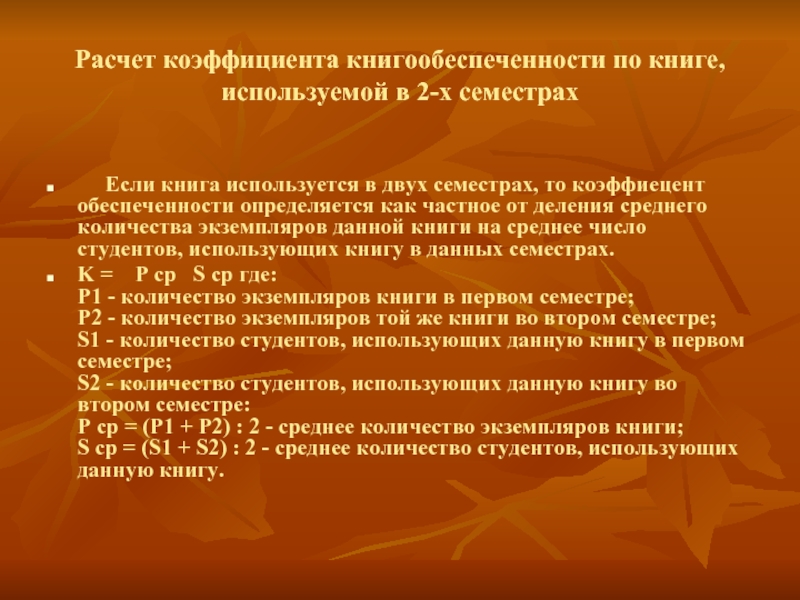 1. расчет коэффициента книгообеспеченности по одной книге. Эта формула применяется, если книга используется в одном семестре или период использования книги не принимается во внимание при расчете.