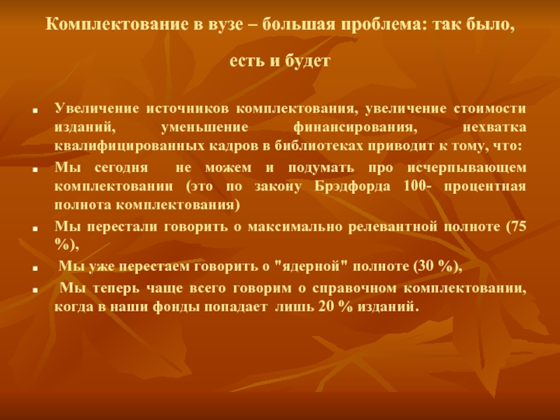 Мы сегодня не можем и подумать про исчерпывающем комплектовании (это по закону Брэдфорда 100- процентная полнота комплектования)