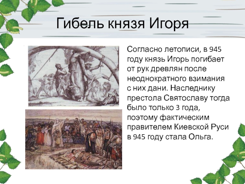 рук древлян после неоднократного взимания с них дани. Наследнику престола Святославу тогда было только 3 года, поэтому фактическим правителем Киевской Руси в 945 году стала Ольга.