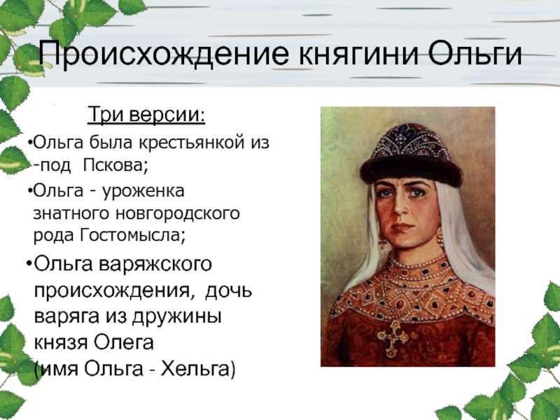 Ольга варяжского происхождения, дочь варяга из дружины князя Олега (имя Ольга - Хельга)
