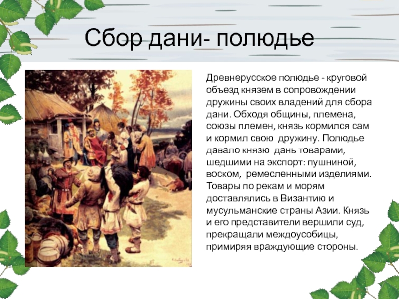своих владений для сбора дани. Обходя общины, племена, союзы племен, князь кормился сам и кормил свою дружину. Полюдье давало князю дань товарами, шедшими на экспорт: пушниной, воском, ремесленными изделиями. Товары по рекам и морям доставлялись в Византию и мусульманские страны Азии. Князь и его представители вершили суд, прекращали междоусобицы, примиряя враждующие стороны.