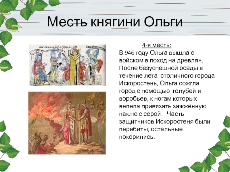 месть: В 946 году Ольга вышла с войском в поход на древлян. После безуспешной осады в течение лета столичного города Искоростень, Ольга сожгла город с помощью голубей и воробьев, к ногам которых велела привязать зажжённую паклю с серой. Часть защитников Искоростеня были перебиты, остальные покорились.