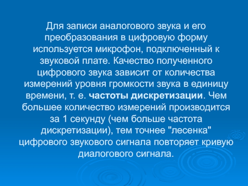 микрофон, подключенный к звуковой плате. Качество полученного цифрового звука зависит от количества измерений уровня громкости звука в единицу времени, т. е. частоты дискретизации. Чем большее количество измерений производится за 1 секунду (чем больше частота дискретизации), тем точнее "лесенка" цифрового звукового сигнала повторяет кривую диалогового сигнала.