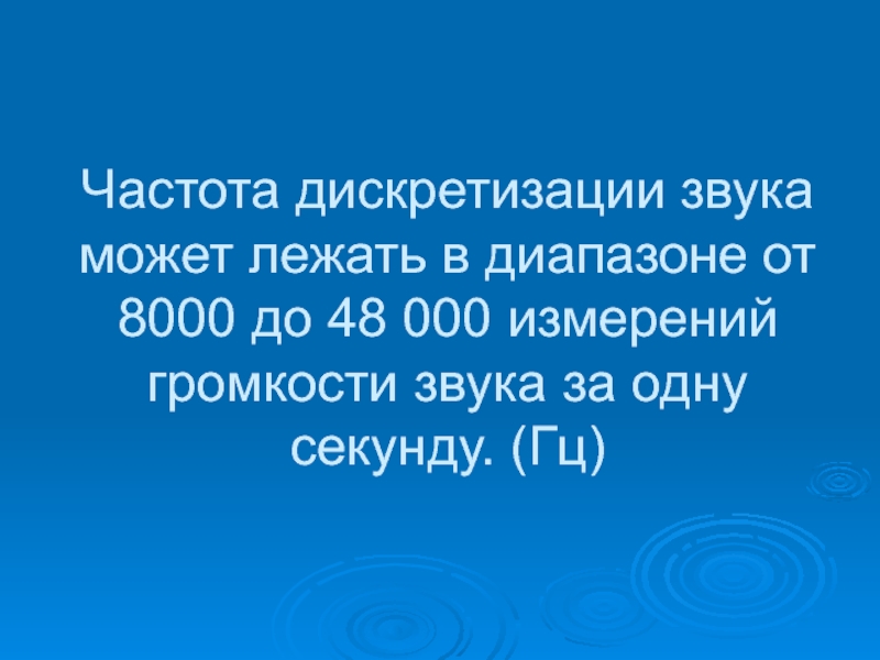 Слайд 15Частота дискретизации звука может лежать в диапазоне от 8000 до 48