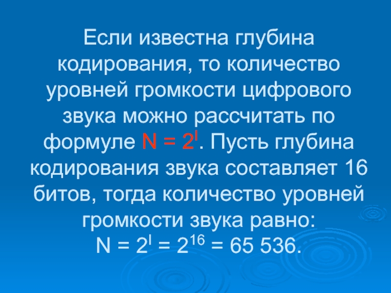 рассчитать по формуле N = 2I. Пусть глубина кодирования звука составляет 16 битов, тогда количество уровней громкости звука равно: